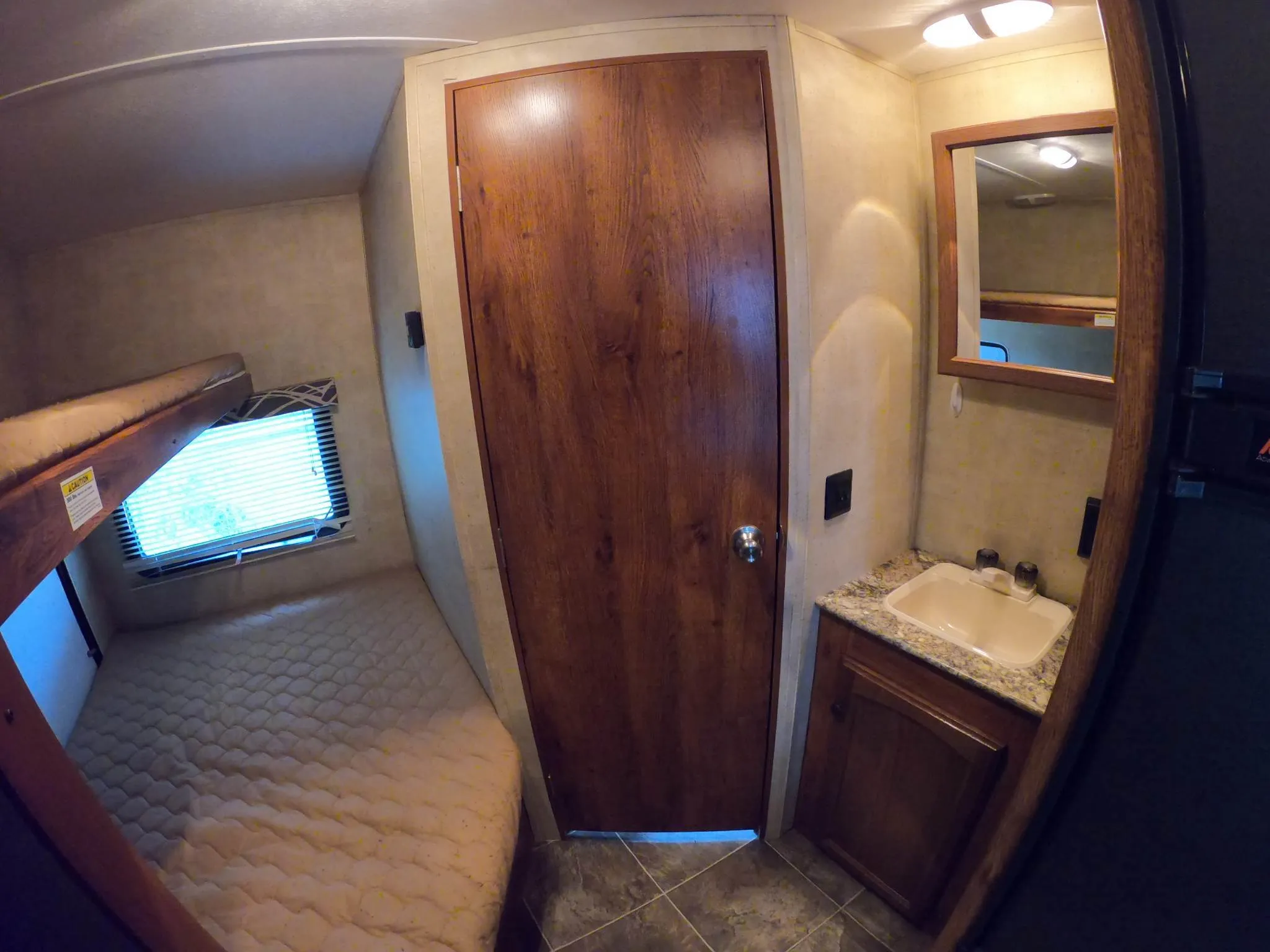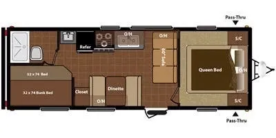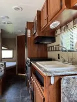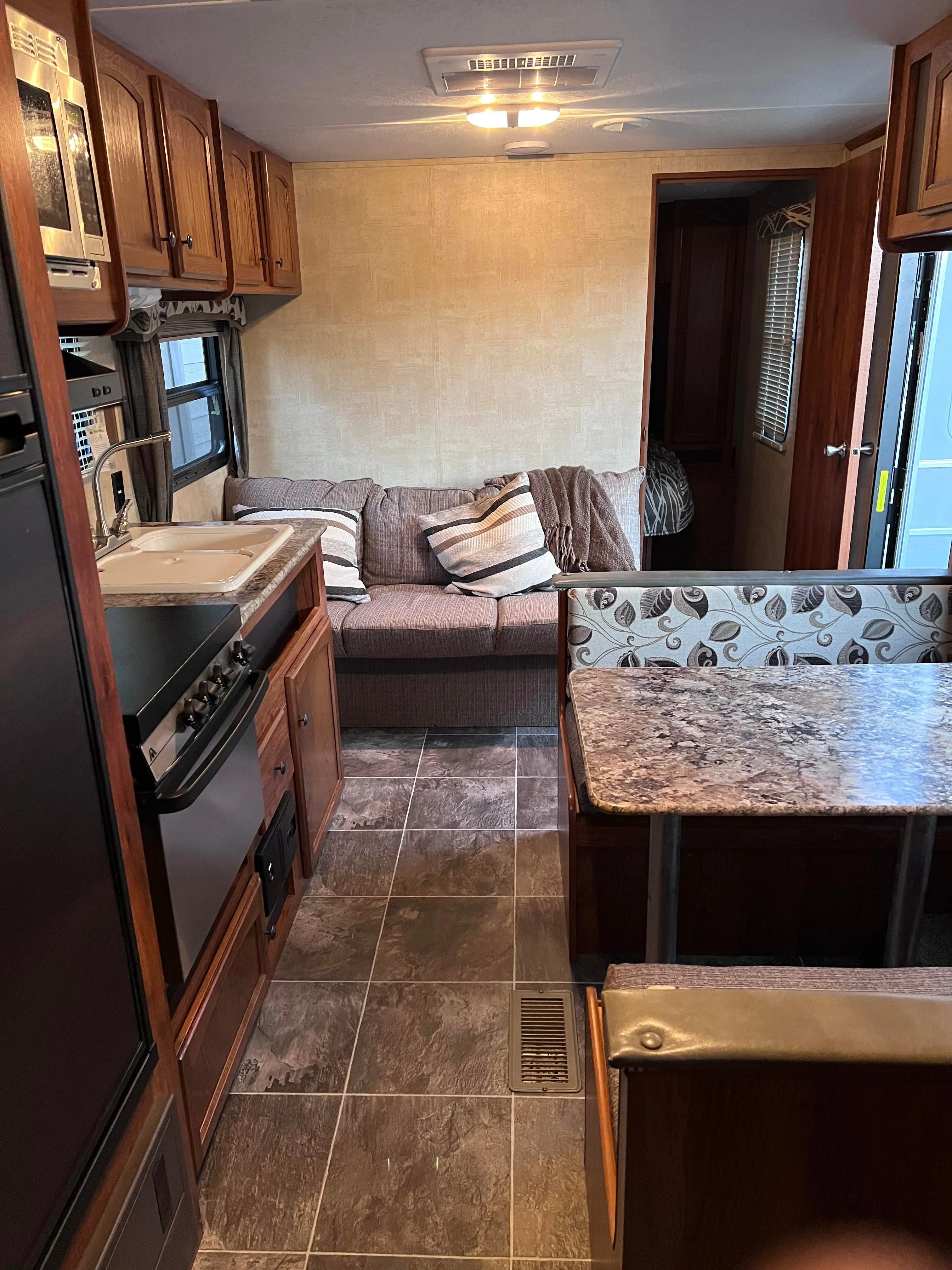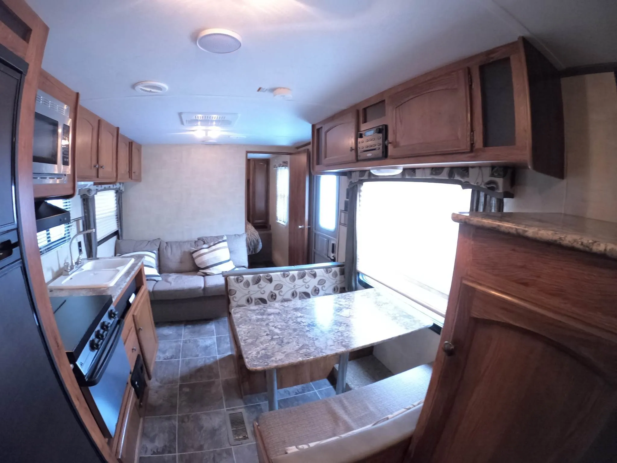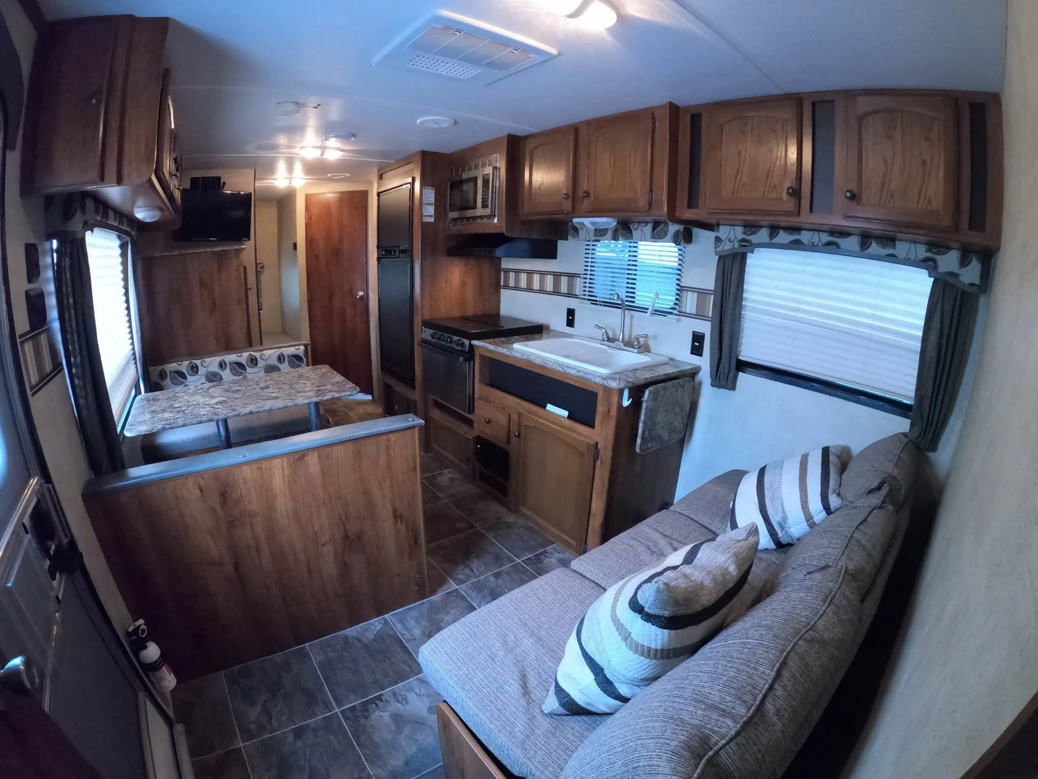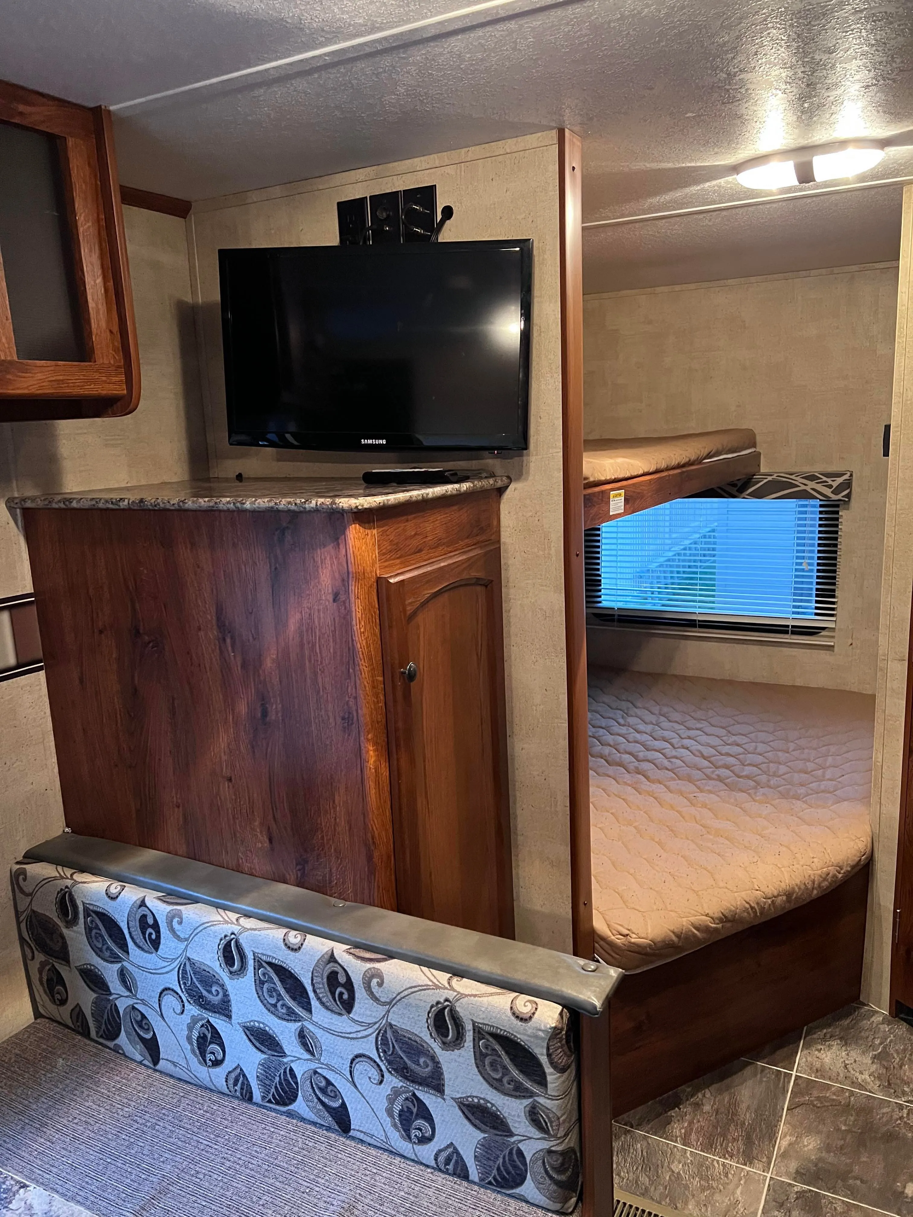 Step inside to find a spacious, well-appointed interior that sleeps up to eight guests. The Hideout boasts a cozy queen-sized master bed, bunk beds for the kids, and a convertible dinette and sofa for extra sleeping space. The fully-equipped kitchen, complete with a refrigerator, microwave, stove, and ample storage, allows you to whip up your favorite meals on the go.