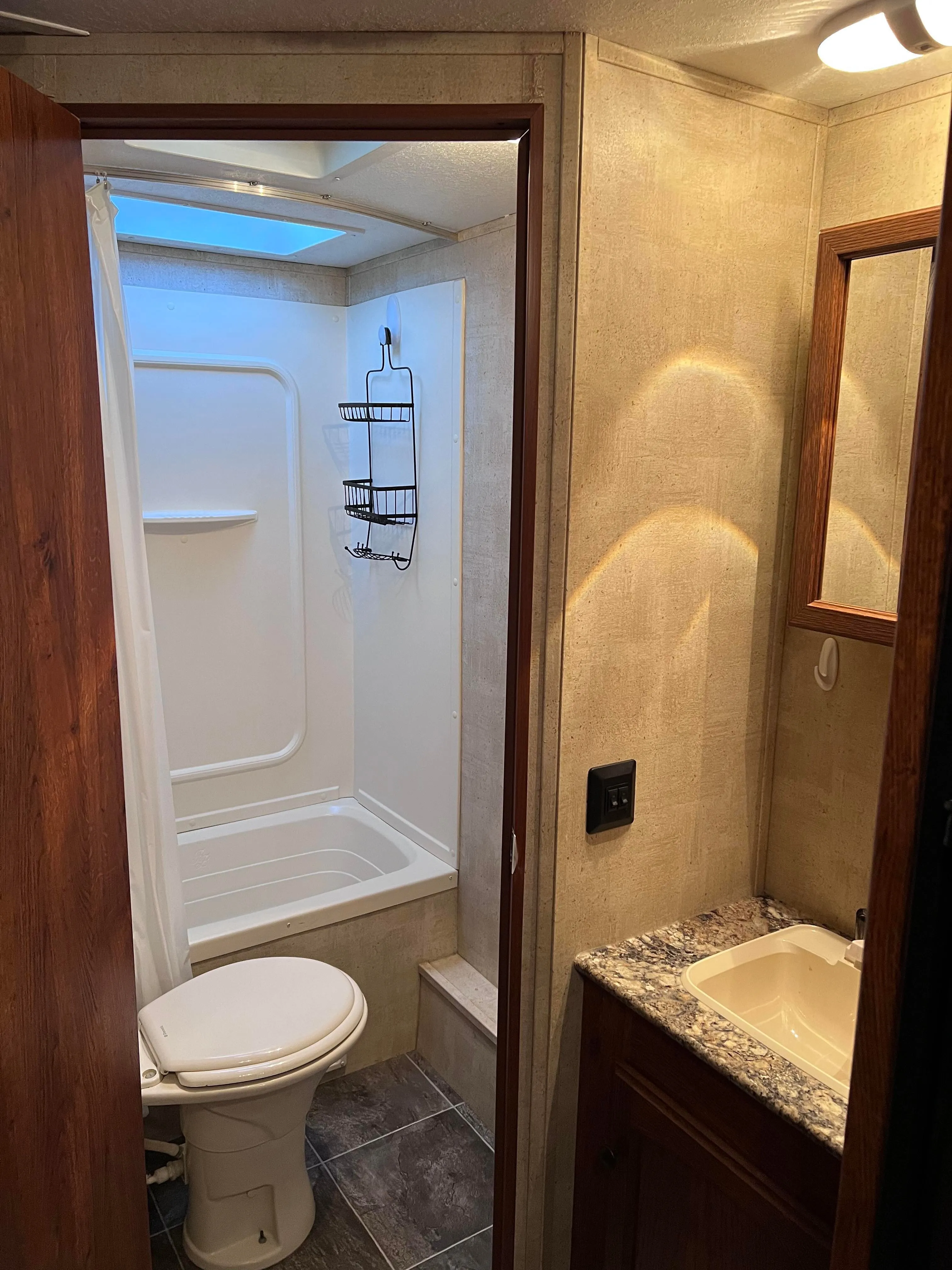 Entertainment is at your fingertips with a flat-screen TV, DVD player, and integrated sound system, ensuring rainy days are just as enjoyable. The bathroom features a full shower, sink, and toilet, providing all the comforts of home.